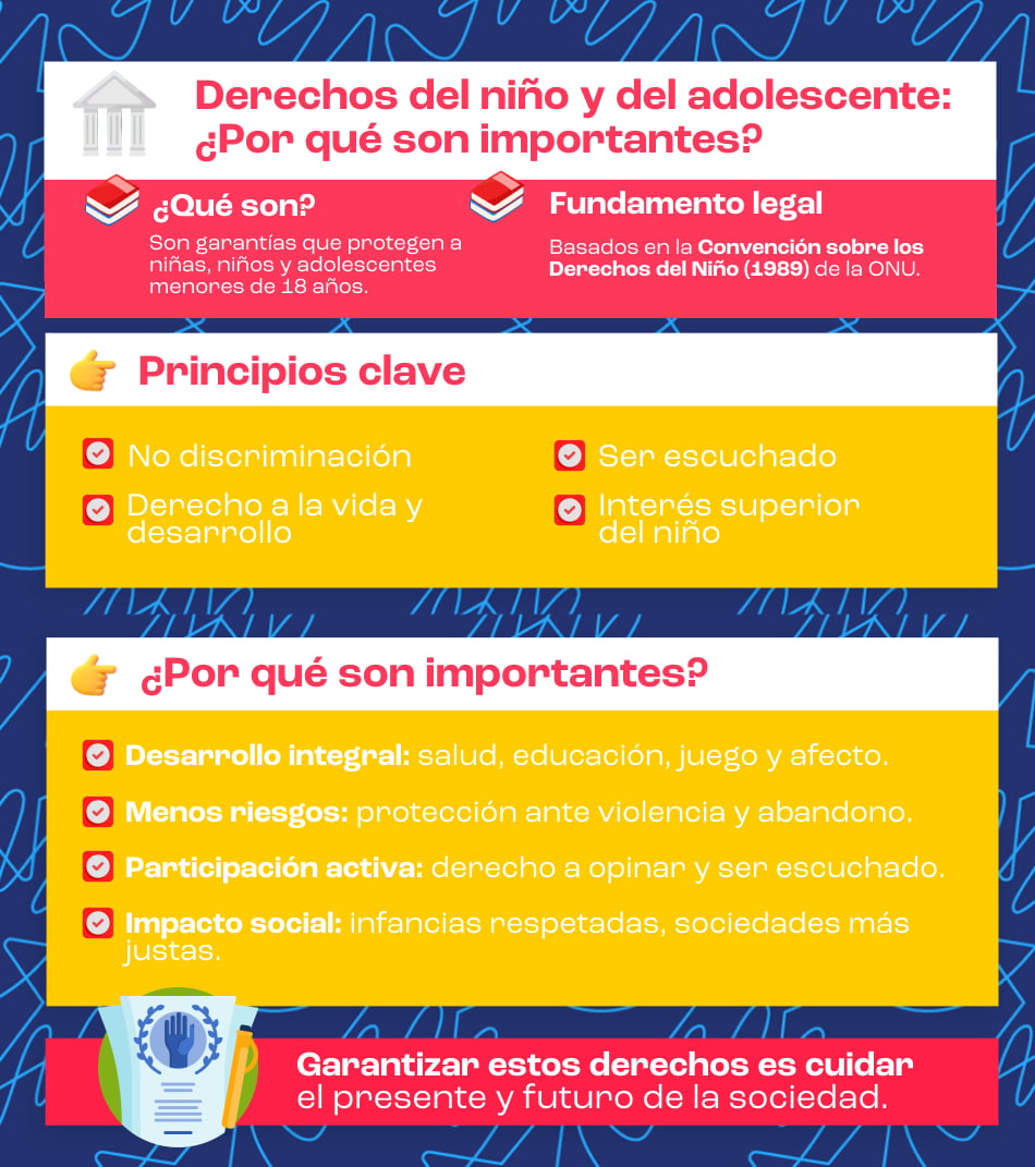 Los derechos del niño y del adolescente son garantías que buscan proteger el bienestar de todas las personas menores de 18 años. Incluyen el acceso a la salud, la educación, la identidad, el juego, la protección contra la violencia y la participación en decisiones que los afecten.
